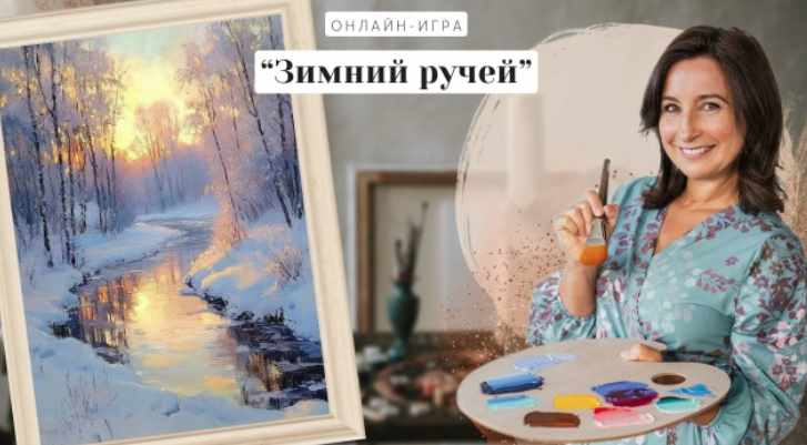 Именно такую картину мы создадим вместе на новой онлайн-игре «Зимний ручей». Вы познакомитесь с техникой передачи световых переходов, научитесь писать отражения на воде и создавать воздушную зиму